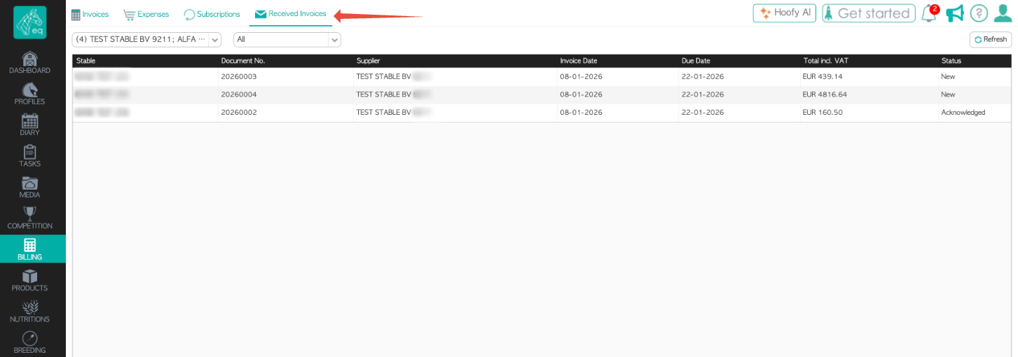 In Equicty Equstable, go to the module Billing → Section Received invoices.
